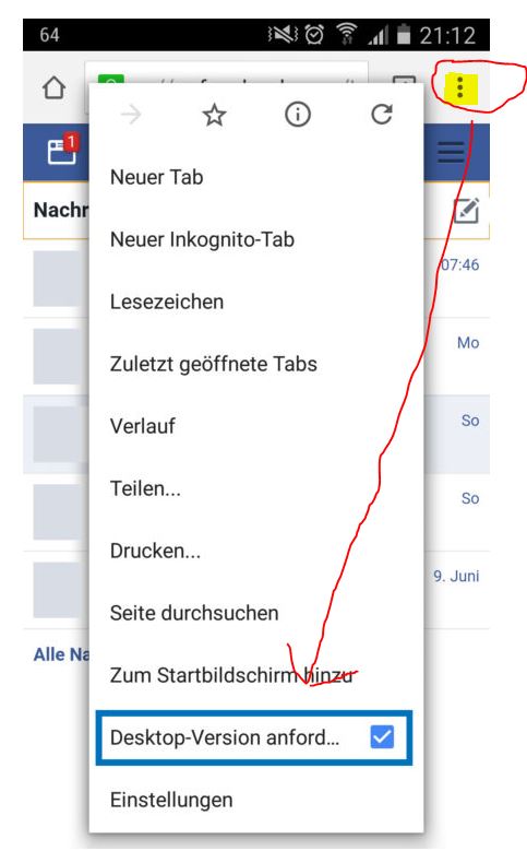Die Lösung: Gehen Sie in Ihrem Browser – die meisten von Ihnen  werden Google Chrome verwenden – auf die drei Punkte oben rechts und wählen Sie ´Desktop Version anfordern´. Sie können dann die angezeigte Seite mit 2 Fingern vergrößern! Danke
