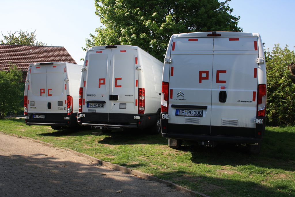 Und in der Nacht sind alle ´Katzen´ grau, genauso wie unsere Transporter. Um uns dann besser zu erkennen, ob noch alle da sind, haben wir: Und für Tagsüber haben wir neuerdings in Spiegelschrift ein großes ´PC´ auf jede Motorhaube geklebt. So können wir uns auch da besser erkennen!