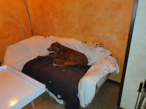 Hunde im Haus: Jede Person die Hunde mit dabei hat, hat folgendes zwingend zu beachten: Das Sofa und der Sessel ist mit Laken so abzudecken (im Hafen, vorne bei der Waschmaschine gibt es genügend Material), dass diese beiden Möbelteile nicht dreckig oder zerstört werden. Wenn niemand im Haus ist, außer die Hunde, ist darauf zu achten, dass alle anderen Zimmer verschlossen sind. Hunde gehören dem Grunde nach auch nicht ins Bett. Nehmt Euch aus dem Hafen ein paar Liegeschalen mit ins Haus und macht es den Hunden kuschelig.